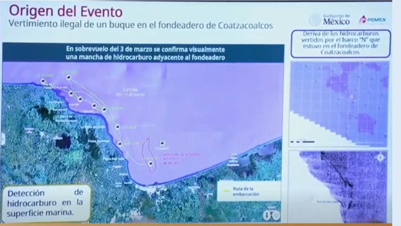 Marina atribuye a buque y emanaciones naturales de chapopoteras el derrame en el Golfo de México; aún no se identifica el buque responsable