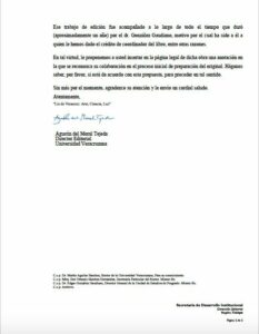 “En tal virtud, le proponemos a usted insertar en la página legal de dicha obra una anotación en la que se reconozca su colaboración en el proceso inicial de preparación del original. Háganos saber, por favor, si está de acuerdo con esta propuesta, para proceder en tal sentido”.