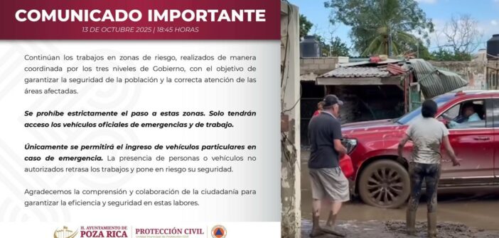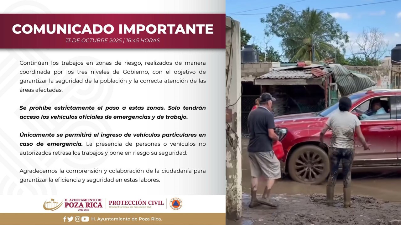 El Ayuntamiento de Poza Rica emitió un comunicado urgente la tarde de este lunes para prohibir estrictamente el acceso a las zonas de riesgo afectadas por las lluvias e inundaciones recientes, una medida que solo permite el paso de vehículos oficiales de emergencia y de trabajo, y restringe la entrada de particulares “únicamente en caso de emergencia”.