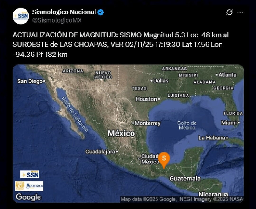 Este domingo 2 de noviembre, un sismo de magnitud 5.3 se registró en el sur del estado de Veracruz, con epicentro ubicado a 48 kilómetros al sureste del municipio de Las Choapas, según reportes del Servicio Sismológico Nacional (SSN).