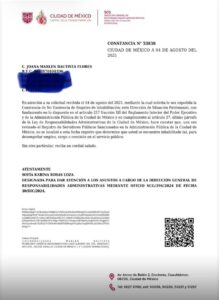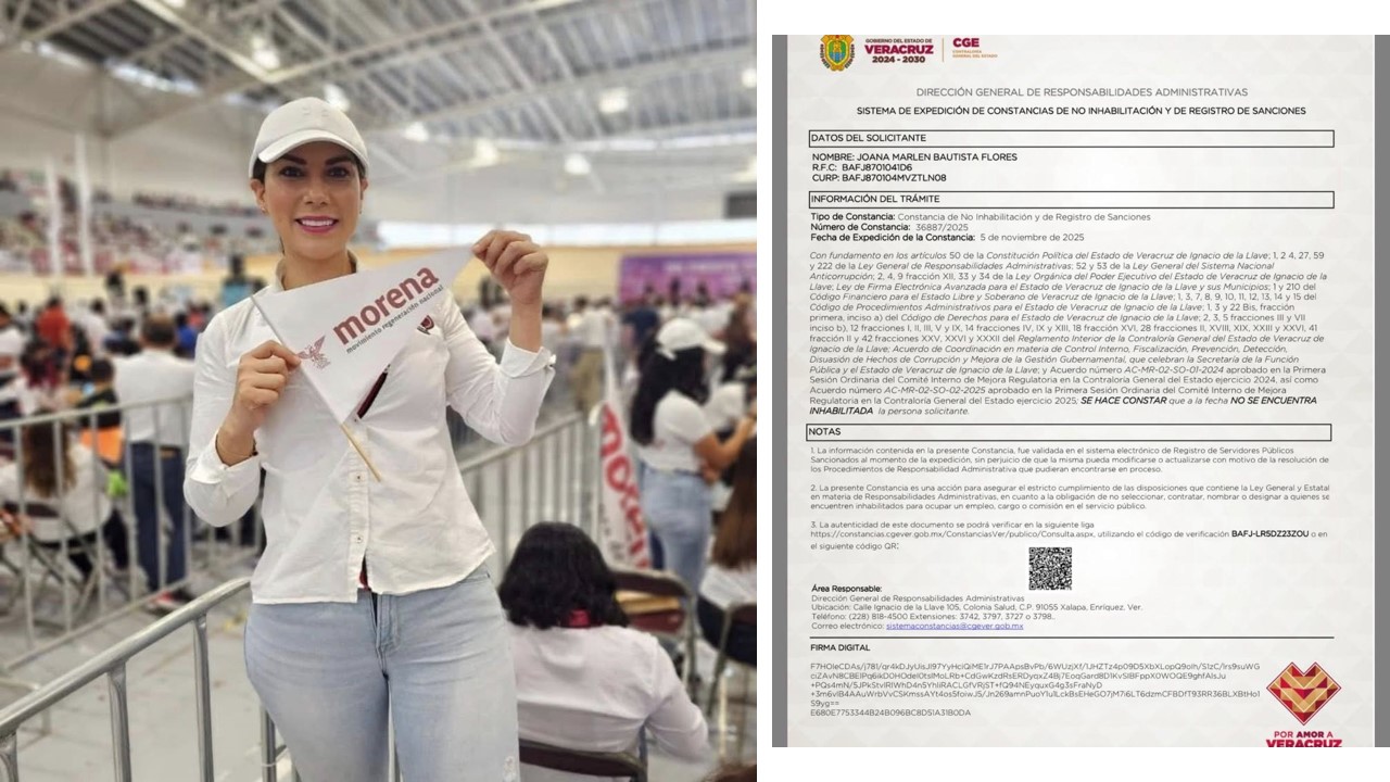 Para ello mostró, además de las constancias expedidas por los gobiernos federal y de la Ciudad de México que ya había exhibido el Metro CDMX –donde actualmente funge como coordinadora de Compras en el Extranjero-, una de la Contraloría General del Estado de Veracruz, expedida este mismo miércoles 5 de noviembre de 2025.