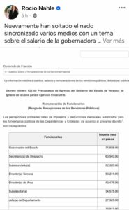 En el mismo post, la gobernadora exhibió el tabulador que en 2016 aplicó para el entonces gobernador priista Javier Duarte en el que percibía un sueldo de 74 mil pesos.