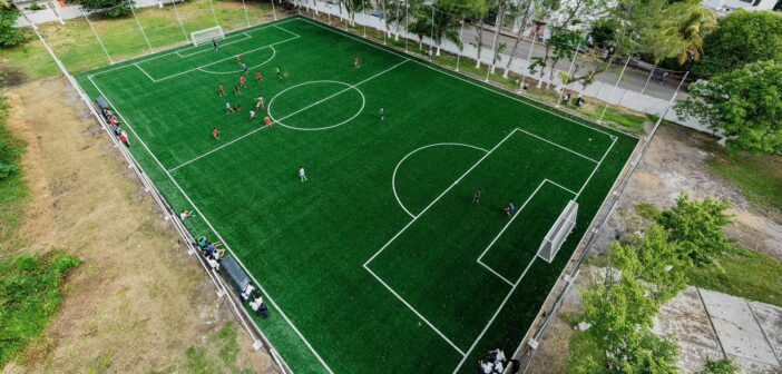 Entre otras acciones que se incluyeron, fue la colocación de más de 3 mil metros cuadrados de pasto sintético, se instalaron porterías y bancas deportivas.