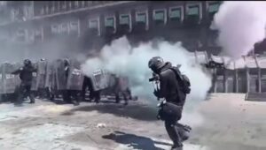 «¡Narcoestado, narcoestado!», gritaron, mientras un grupo lograba derribar una parte del cerco en la esquina de Pino Suárez. «¡Carlos no murió, el Gobierno lo mató!», coreaba la gente. El gas de extintores se confundía con las piedras hasta que la valla se vino abajo.