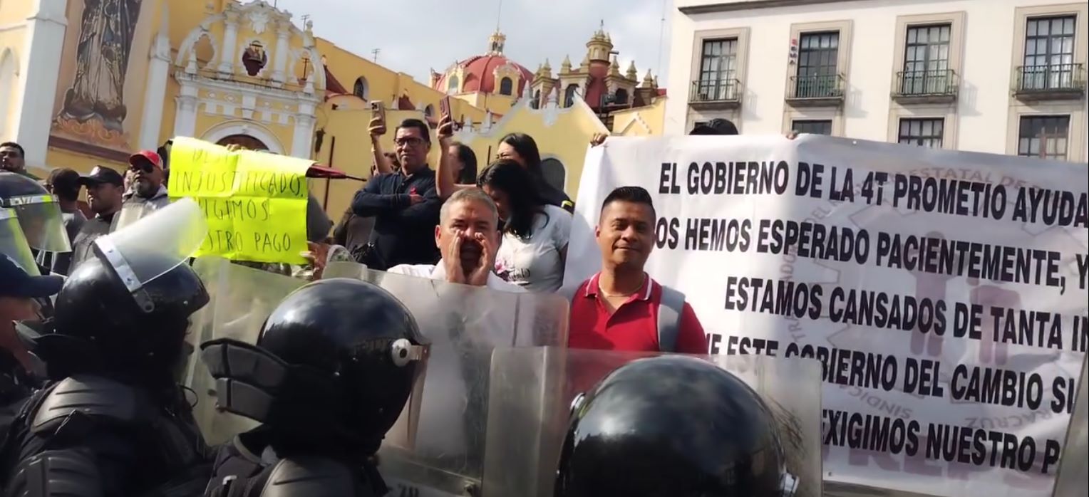 En Xalapa, elementos antimotines de la SSP Veracruz replegaron este martes a extrabajadores del extinto Seguro Popular que bloqueaban la calle Enríquez frente al Palacio de Gobierno, obligándolos a retirarse hacia la Plaza Lerdo.