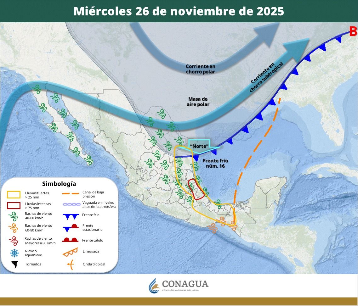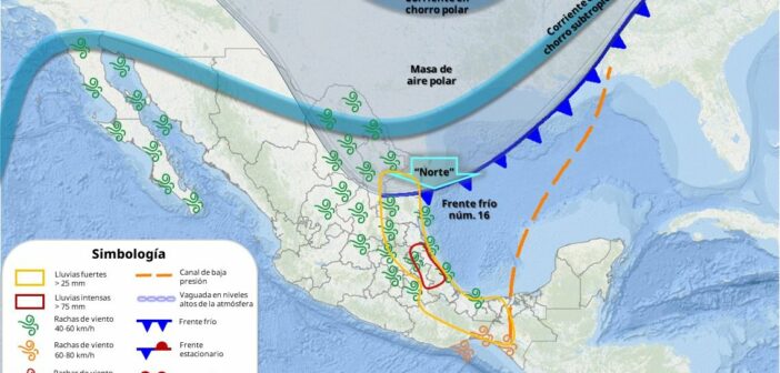 El nuevo frente frío número 16 y su Gran Masa de Aire Marítimo Polar cubrirán al territorio mexicano, provocando temperaturas bajo cero de hasta los -10 grados, chubascos, tormentas eléctricas y la probabilidad de caída de granizo, esto según el pronóstico del clima del Servicio Meteorológico Nacional (SMN) de la Comisión Nacional del Agua (Conagua).
