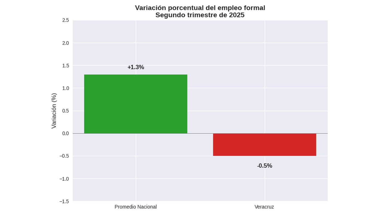 Veracruz fue una de las entidades que registró retroceso en el empleo formal durante el segundo trimestre de 2025: mientras a nivel nacional los puestos remunerados crecieron 1.3 por ciento, en el estado se reportó una caída de 0.5%, de acuerdo con el Instituto Nacional de Estadística y Geografía (INEGI).