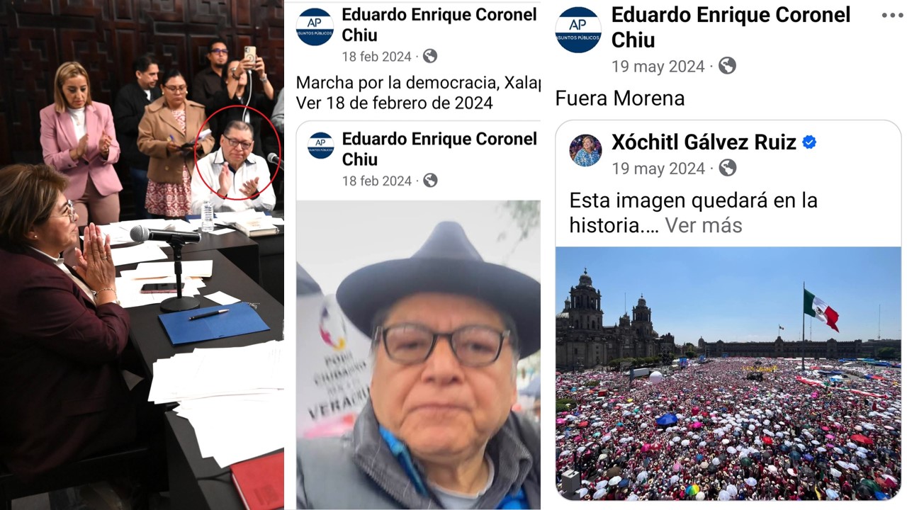 En la red social de Eduardo Coronel en Facebook permanecen publicaciones de 2024, en las que el hoy funcionario municipal morenista participó en las marchas de la llamada “marea rosa” en defensa de la democracia, así como apoyó a la candidata de Acción Nacional a la Presidencia de la República Xóchitl Gálvez, con arengas de “fuera Morena”.