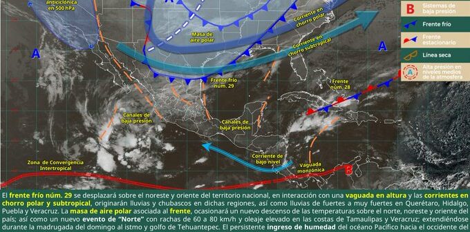 A través de su informe diario, la Conagua advirtió que el frente frío número 29 se desplaza sobre el noreste y oriente del territorio nacional, en interacción con una vaguada en altura y las corrientes en chorro polar y subtropical.