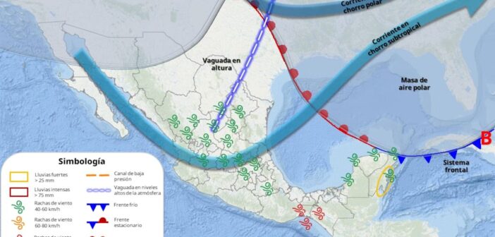 El Servicio Meteorológico Nacional (SMN) informó que durante el miércoles 21 y jueves 22 de enero un sistema frontal en combinación con vaguadas en niveles altos de la atmósfera y la corriente en chorro subtropical provocará un periodo de inestabilidad en gran parte del país, con lluvias, chubascos, rachas fuertes de viento, oleaje elevado y un marcado descenso de temperaturas durante las madrugadas.