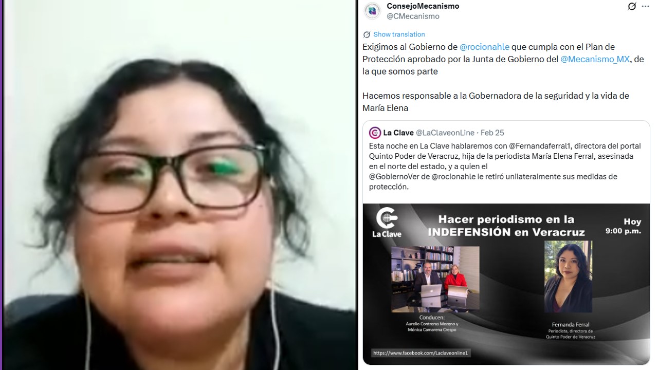 En entrevista en La Clave con los periodistas Mónica Camarena y Aurelio Contreras, María Fernanda de Luna Ferral, directora del portal Quinto Poder de Veracruz, y además hija de la periodista María Elena Ferral que fue asesinada hace seis años y cuyo caso permanece impune, denunció que la Secretaría de Seguridad Pública de Veracruz le retiró unilateralmente y sin notificarla directamente los dos escoltas que la resguardaban como parte de su plan de protección, dispuesto por el Mecanismo de Protección de Periodistas de la Secretaría de Gobernación.