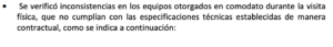 Entre las fallas documentadas destacan equipos incompletos, incumplimiento de características técnicas, ausencia de especificaciones verificables y equipos sin marca o modelo identificable.