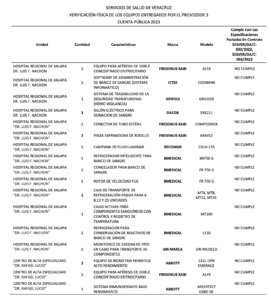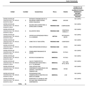 Los equipos observados incluyen sistemas de aféresis, software de banco de sangre (incluido sistema ICTZE, modelo COSIBANK), equipos de refrigeración médica, sistemas de trazabilidad transfusional y dispositivos de cadena de frío.