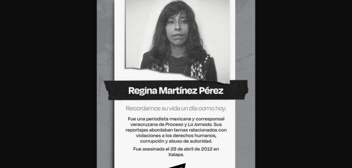 Regina Martínez Pérez, periodista especializada en corrupción, violaciones a derechos humanos y movimientos sociales, fue asesinada el 28 de abril de 2012, en su domicilio en Xalapa, Veracruz.