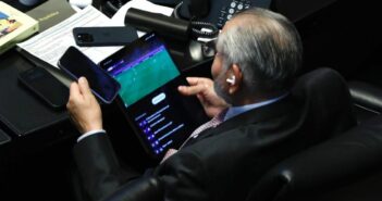 Bien preocupado: Captan a Adán Augusto López siguiendo el partido de la Champions durante sesión del Senado
